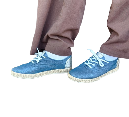 ✔ Extérieur en toile bleu pailleté, effet jean, avec un talon en cuir argenté brillant