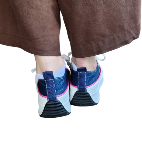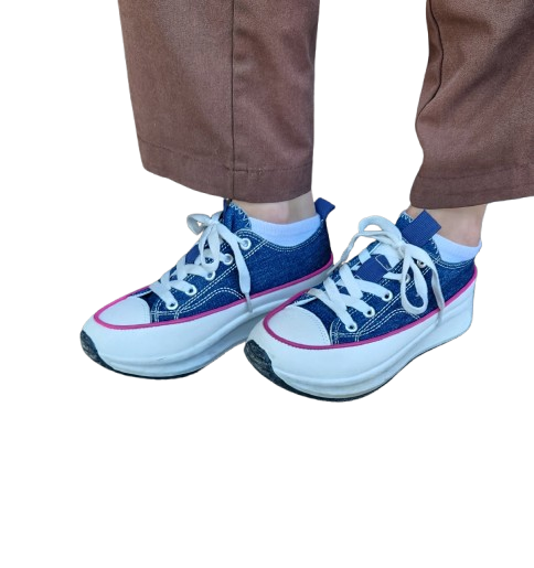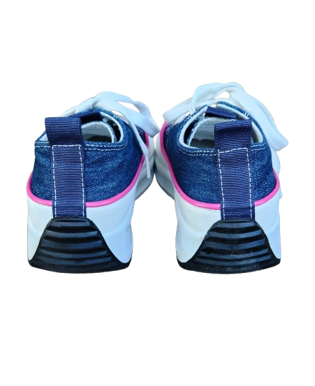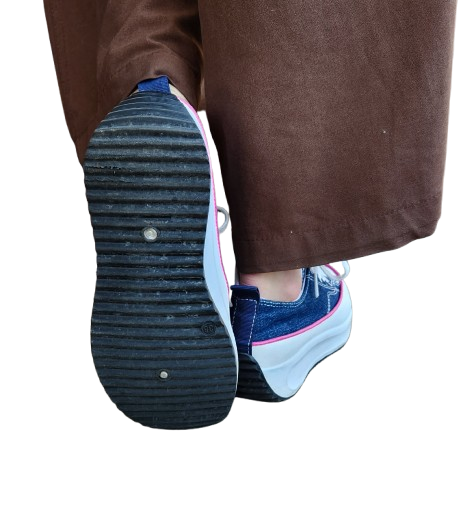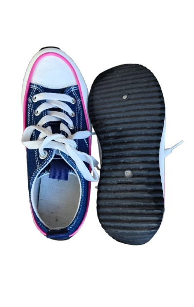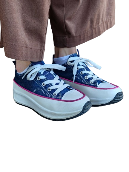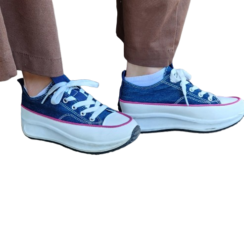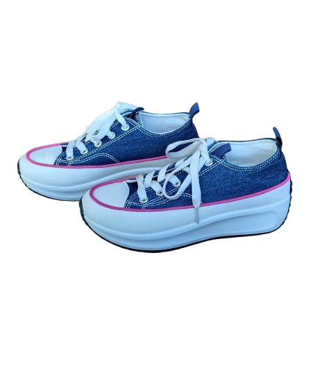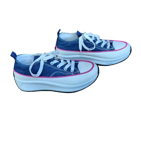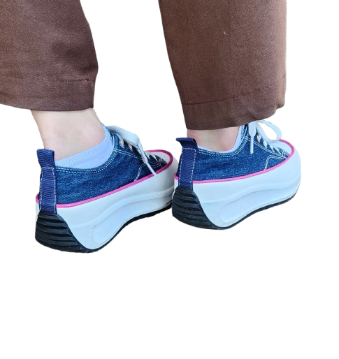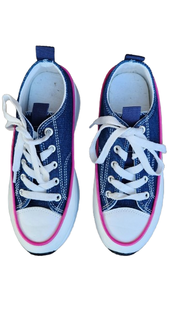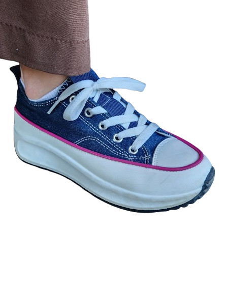 ✔ Baskets en toile effet jean avec liseret rose, lacets blancs plats