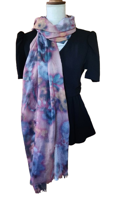 ✔ Grand foulard léger imprimé, esprit tie and dye, bords ourlés en finition et petite frange