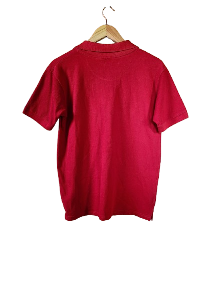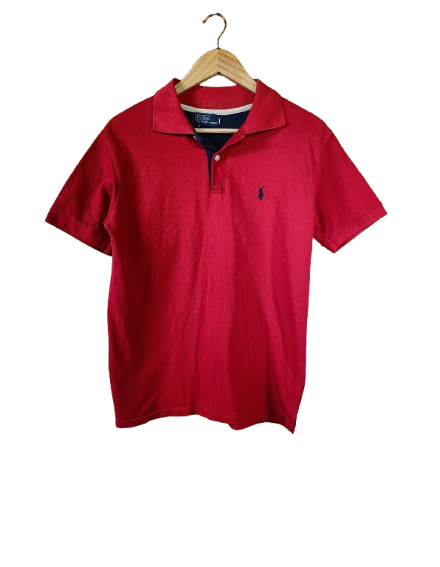 ✔ Polo manches courtes rouge avec logo bleu foncé, boutons gravés